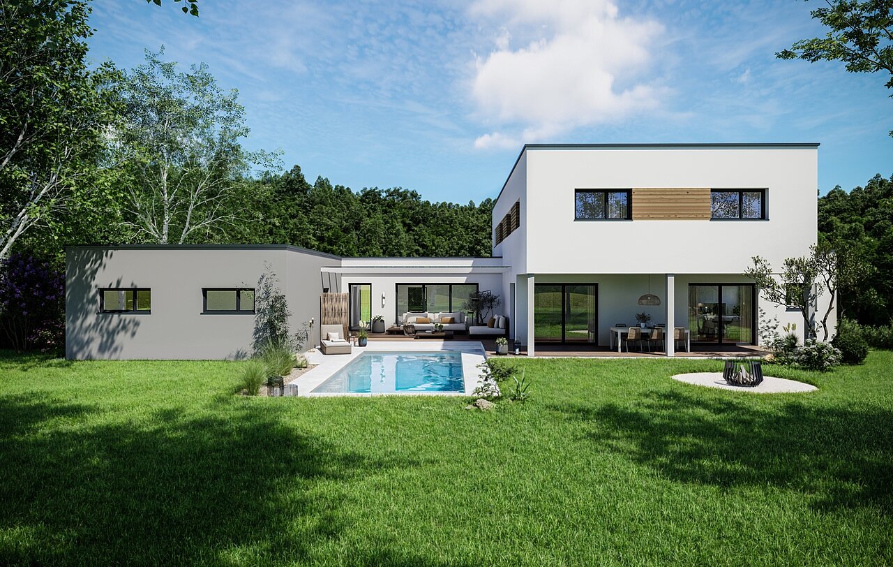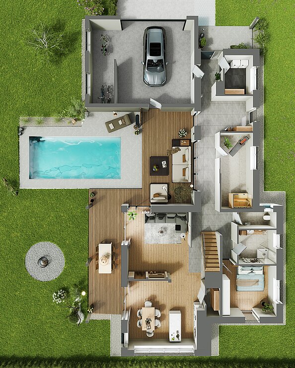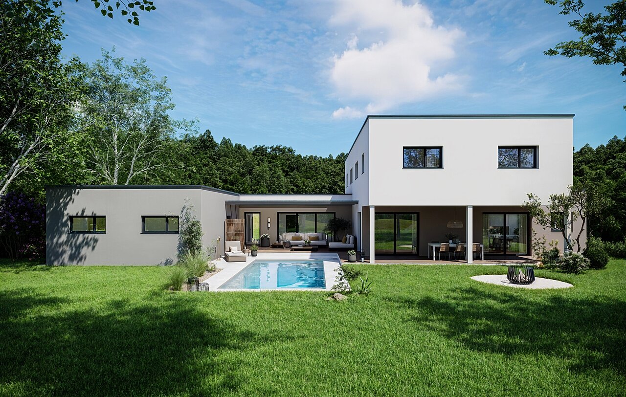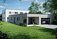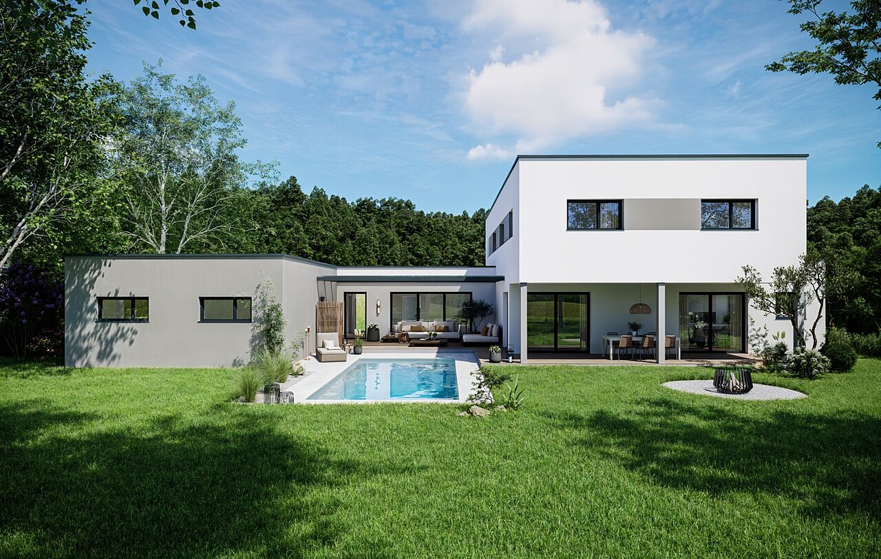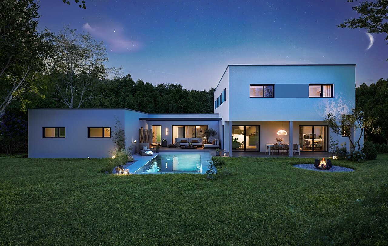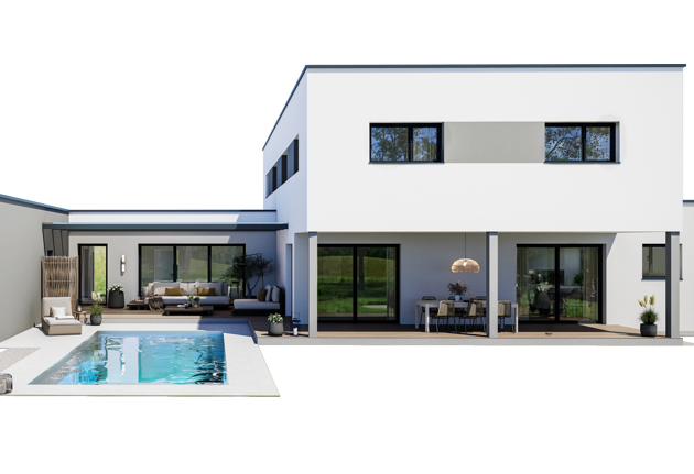 Die Frontansicht ist geprägt von dem auskragenden Obergeschoss, das mit dem geschützten Innenhof und der angebauten Garage eine puristische Komposition bildet und viele Gestaltungsmöglichkeiten offen lässt. Der überdachte Innenhof bildet den Mittelpunkt dieses Hauses, er erweitert den Wohnraum ins Freie und ist Zugang zu Wellness und Sauna. Ein Swimmingpool rundet diesen Wohntraum ab. Dieses Haus sieht auch mit Satteldach chic aus.
