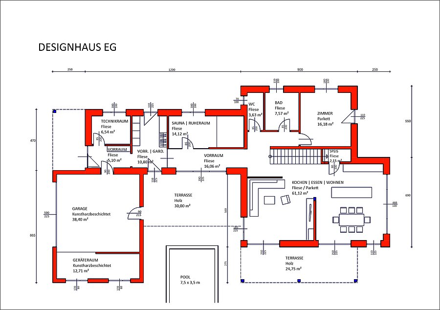 Dieses Haus ohne Keller besitzt eine große Garage mit separatem Nebenraum und einem eigenen Raum für die Haustechnik.