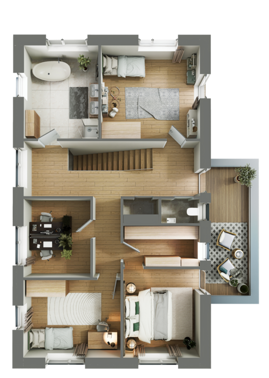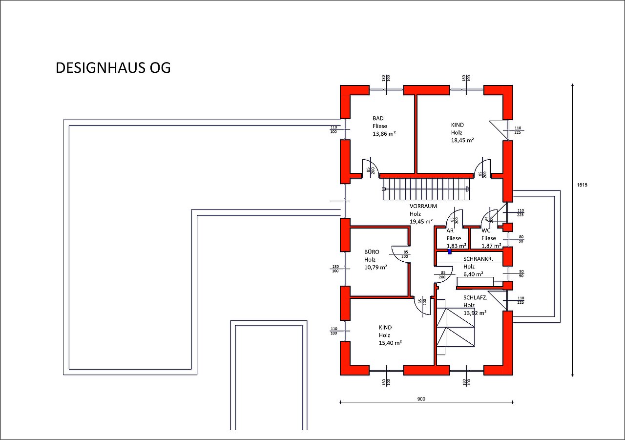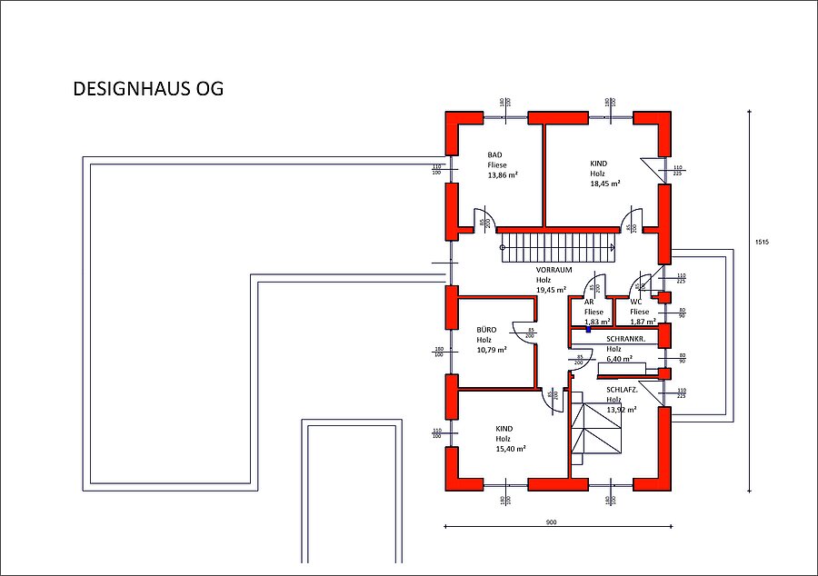 Der aufgesetzte Baukörper beheimatet die ruhigen Rückzugsräume. Hier finden 2 bis 3 Kinderzimmer leicht Platz. Bei der Variante mit Satteldach ergibt sich zusätzlicher Stauraum unter dem Dach.