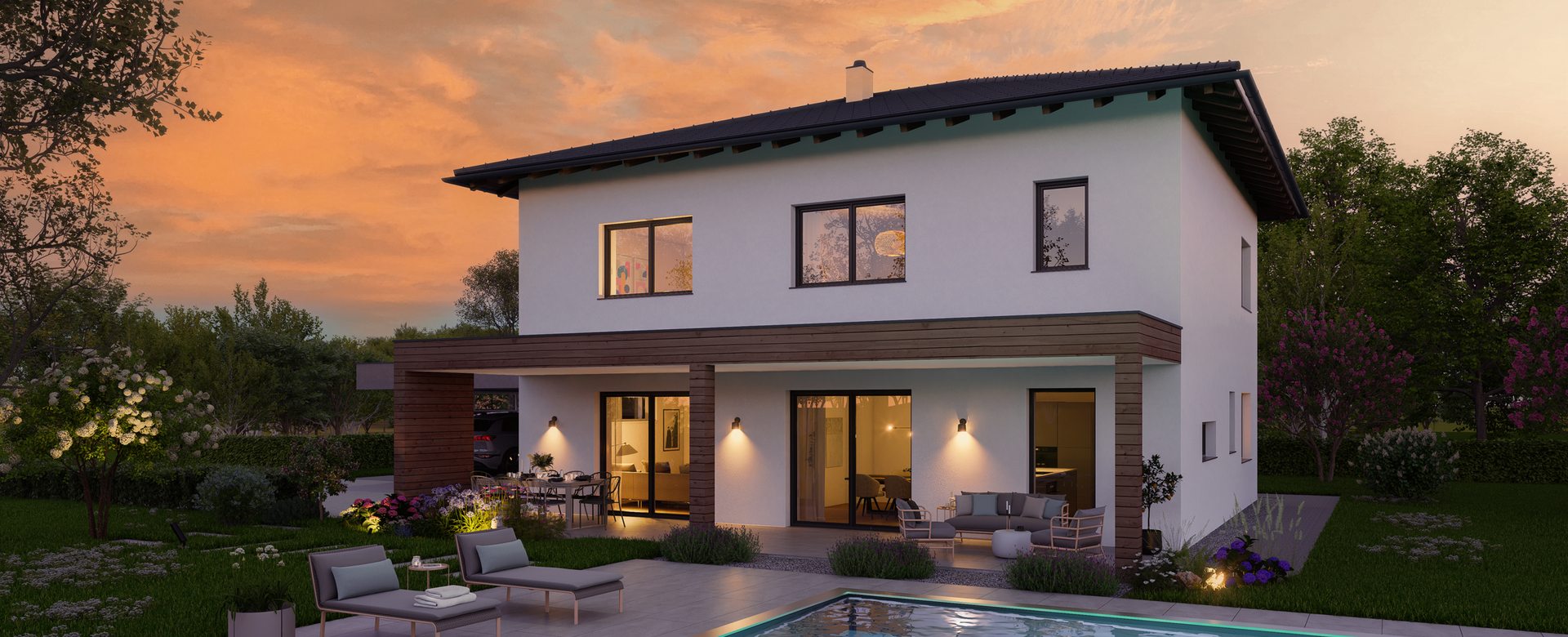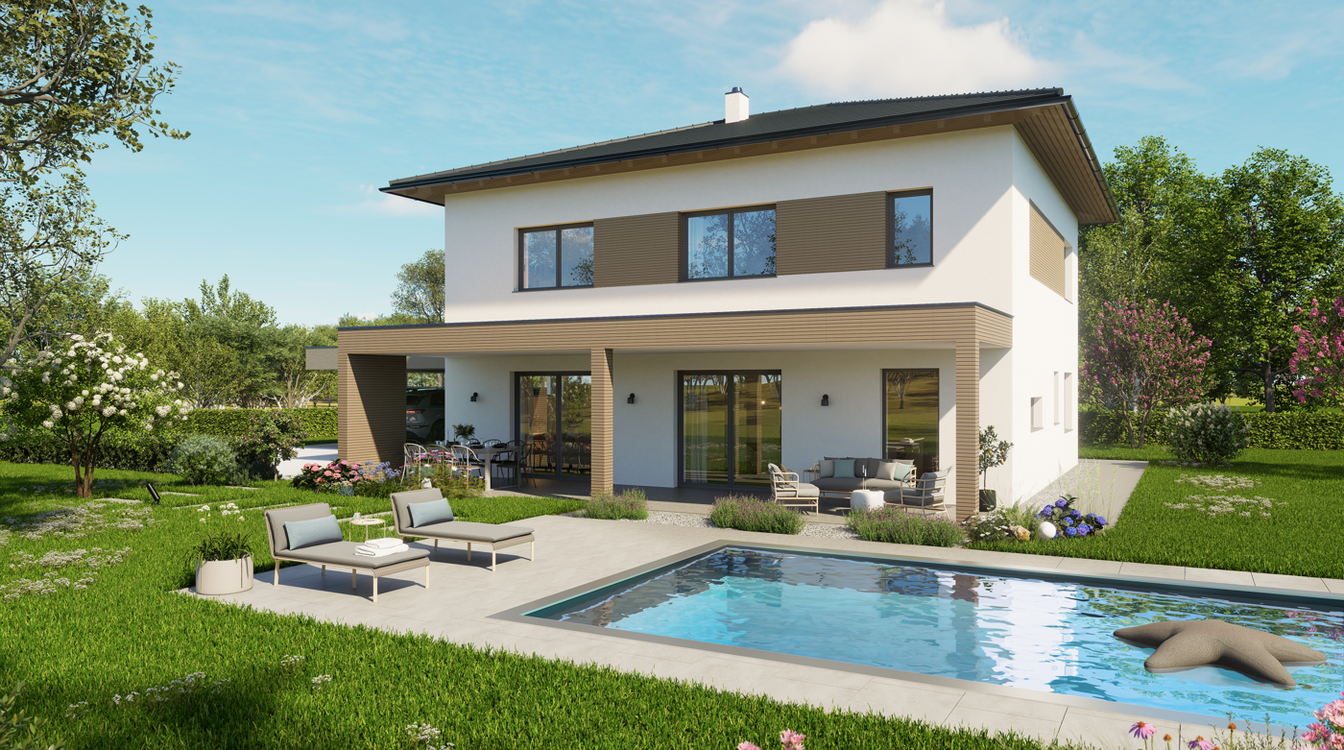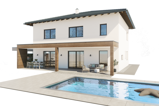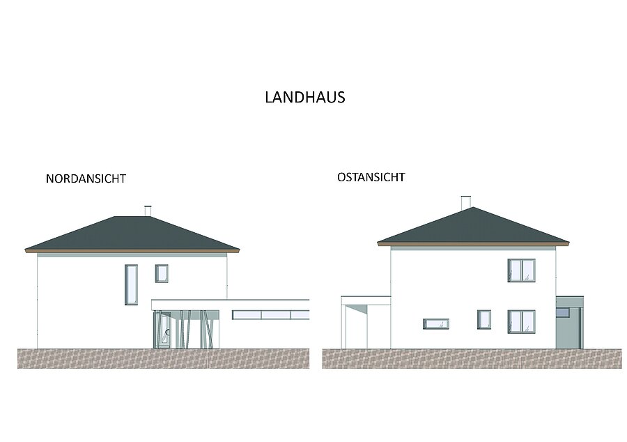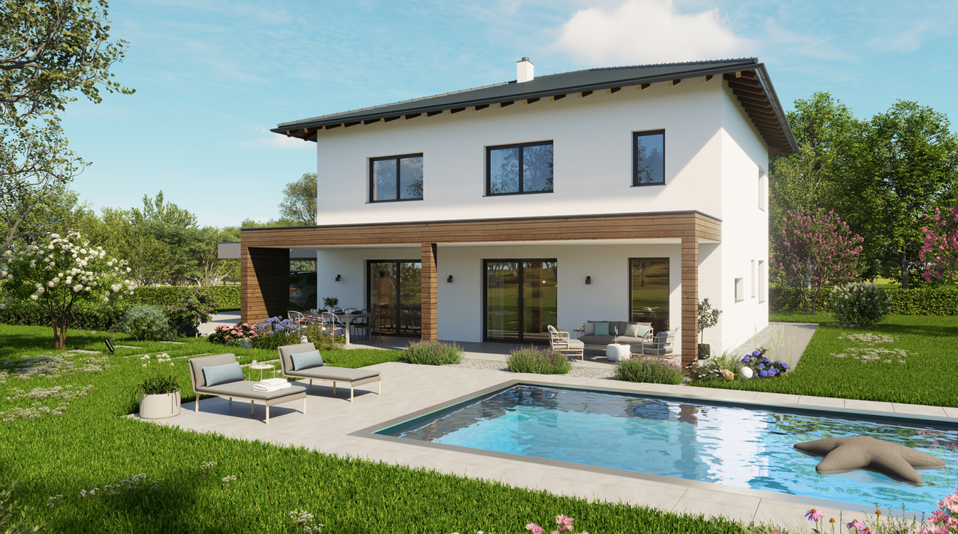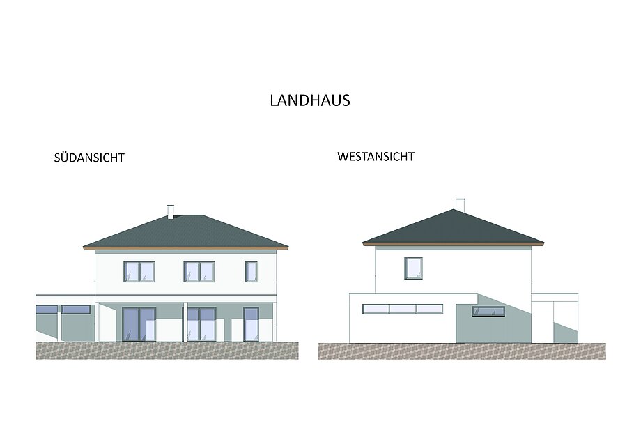 Mit dem Landhaus ist man für alle Eventualitäten des Familienalltags gerüstet. Es ist ein geräumiges, zweistöckiges Wohnhaus mit typischem Walmdach. Die ländlich moderne Bauweise passt sich durch sein ansprechendes, geradliniges Design hervorragend jedem Ortsbild an. Das flache Walmdach steht für Raumgewinn und Eleganz. Für die persönliche Note sorgt die markante Terrassenüberdachung, die auch Platz für individuellen Gestaltungsspielraum lässt.