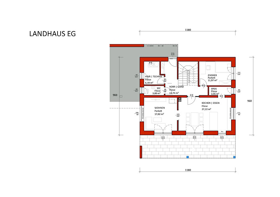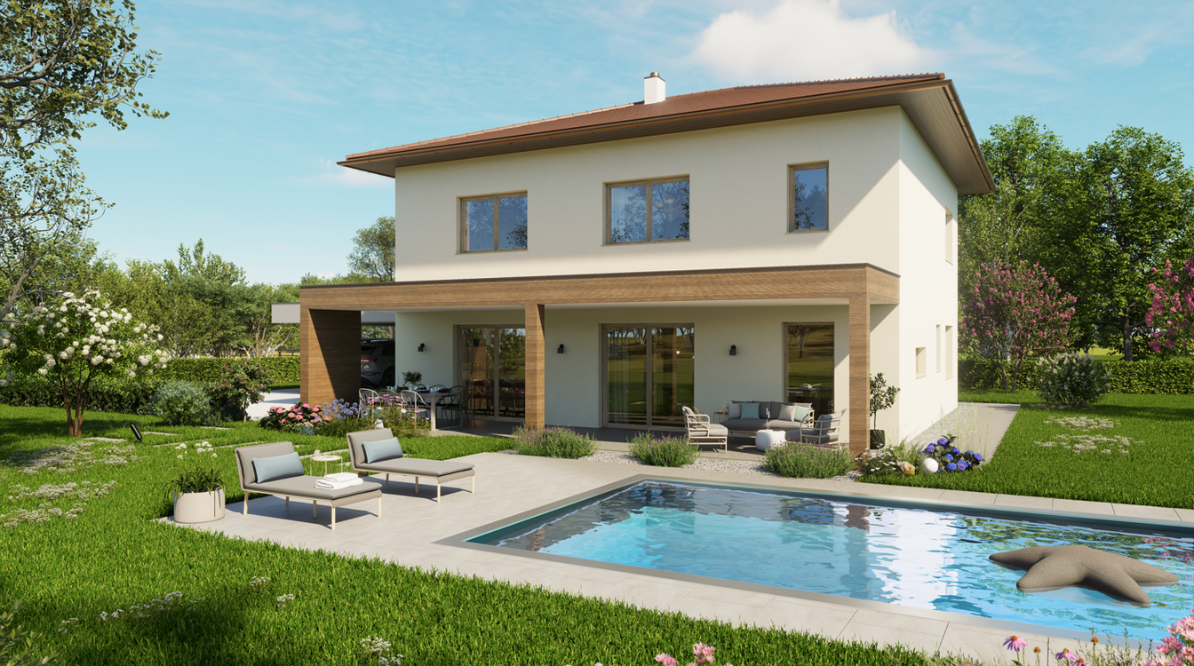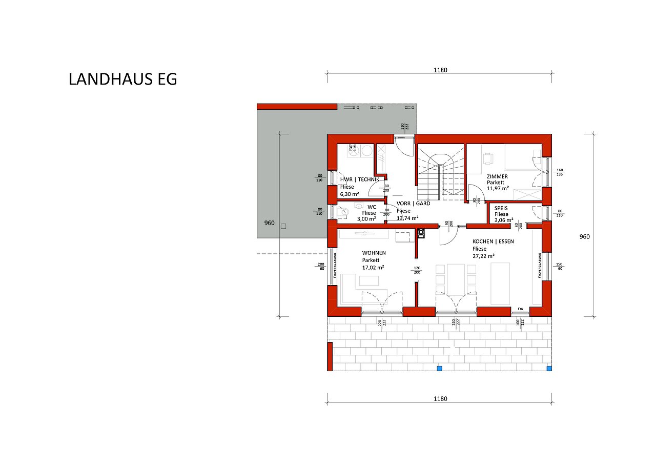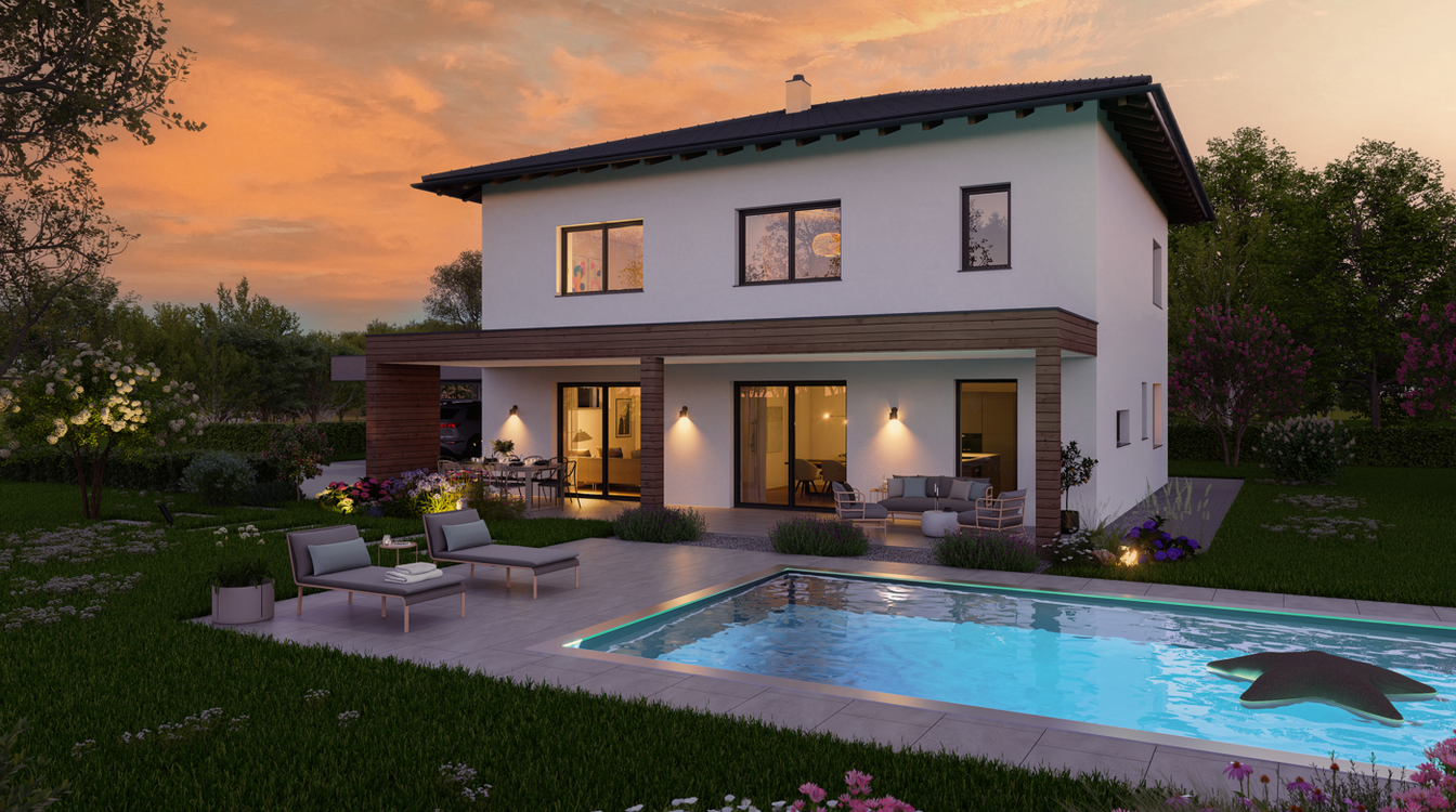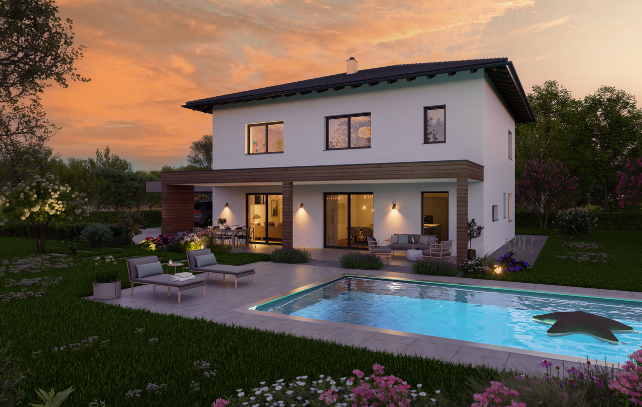 Mit dem Landhaus ist man für alle Eventualitäten des Familienalltags gerüstet. Es ist ein geräumiges, zweistöckiges Wohnhaus mit typischem Walmdach. Die ländlich moderne Bauweise passt sich durch sein ansprechendes, geradliniges Design hervorragend jedem Ortsbild an. Das flache Walmdach steht für Raumgewinn und Eleganz. Für die persönliche Note sorgt die markante Terrassenüberdachung, die auch Platz für individuellen Gestaltungsspielraum lässt.