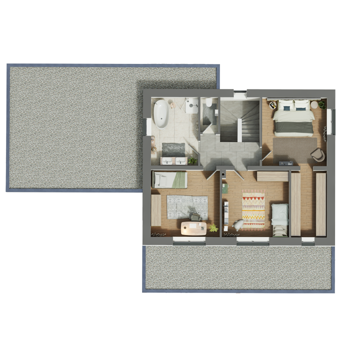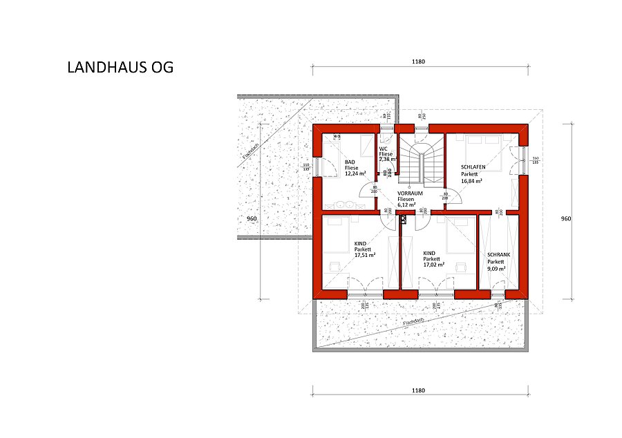 Das Obergeschoß zeichnet sich durch eine sehr ökonomische Raumaufteilung mit kurzen Wegen aus. Zwei helle, großzügige, nach Süden ausgerichtete Kinderzimmer und ein ruhiges, im Norden gelegenes Schlafzimmer sorgen für eine hohe Lebensqualität.