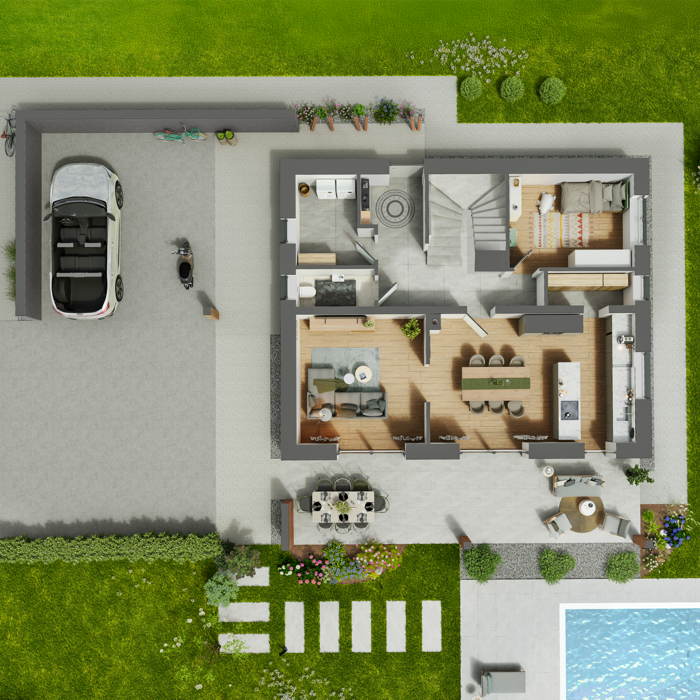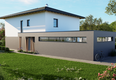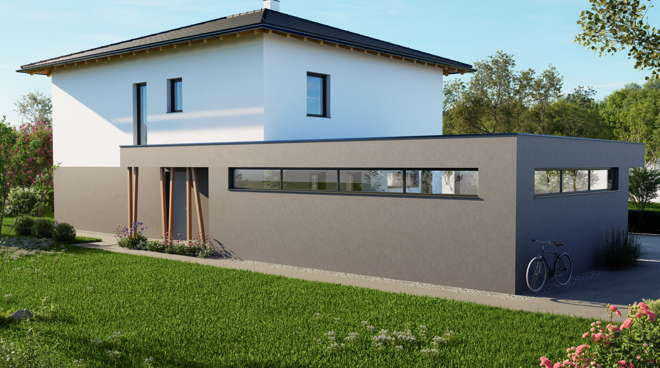 Wohn- und Essbereich sind klar voneinander abgeteilt und lassen eine getrennte Nutzung zu. Beide Bereiche haben einen direkten Zugang zu Terrasse und Garten. Der Autoabstellplatz kann offen als Carport oder geschlossene Garage gestaltet werden, der flache Bau bildet einen schönen Kontrast zum Haus.