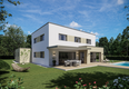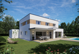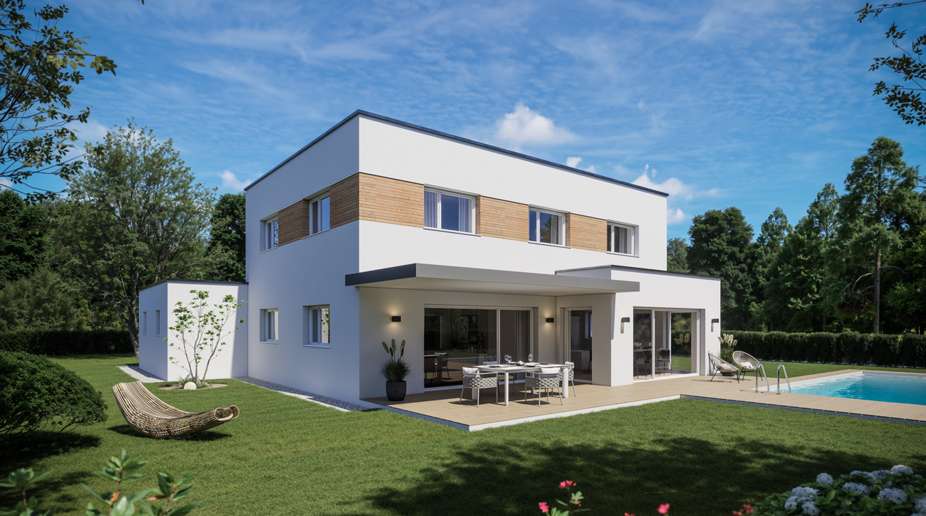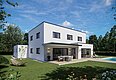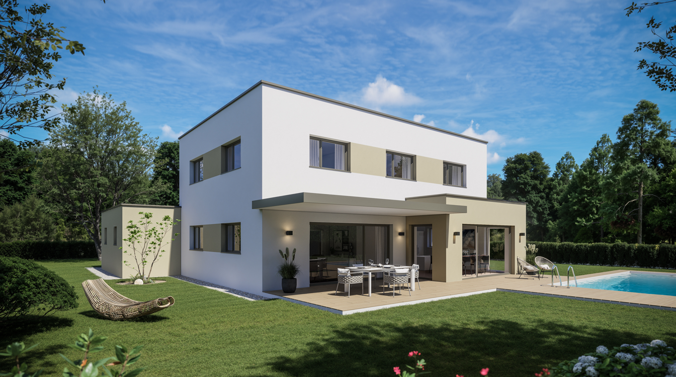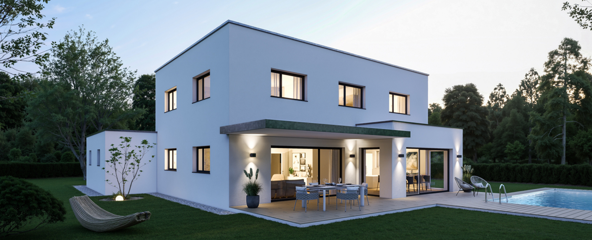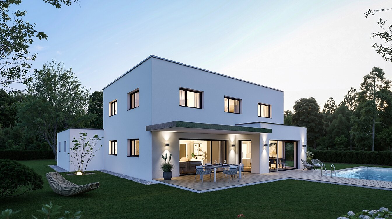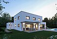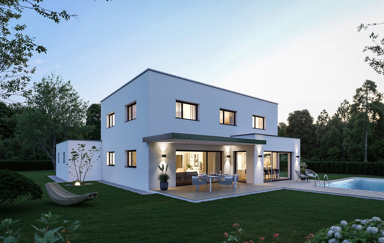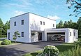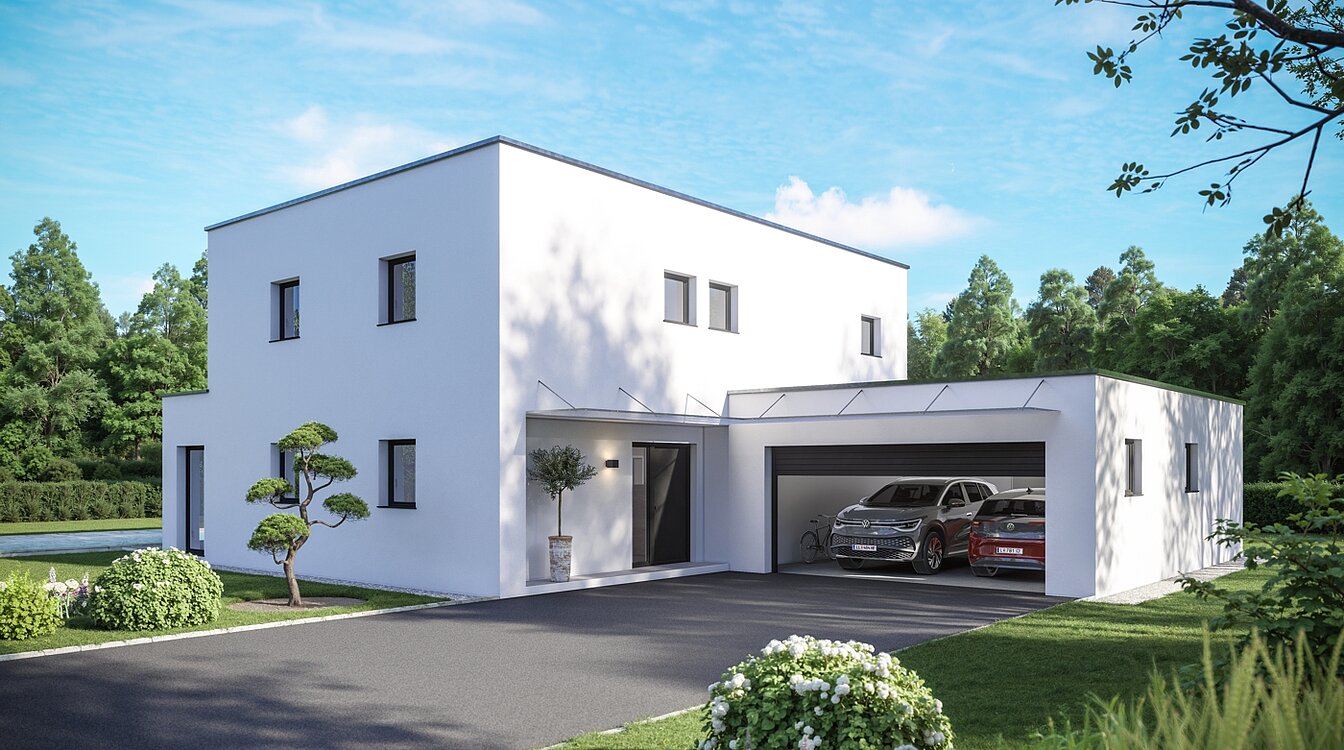 Die moderne Architektur mit Flachdach ist einfach und kostengünstig umzusetzen und bietet ausreichend Platz für eine größere Familie. Großzügige Fensterflächen im Süden nutzen die Sonnenenergie optimal und schaffen einen lichtdurchfluteten Innenraum. Die Ausführung ohne Keller ist speziell für ebene Grundstücke geeignet. Optisch bietet dieser Baustil durch verschiedene Farbvarianten viele Gestaltungsmöglichkeiten. Mit dem Einsatz von Fassadenplatten bekommt dieses Haus einen besonders modernen Look.