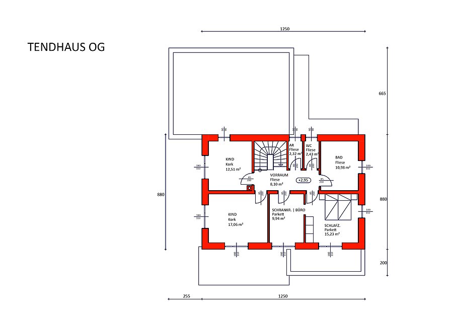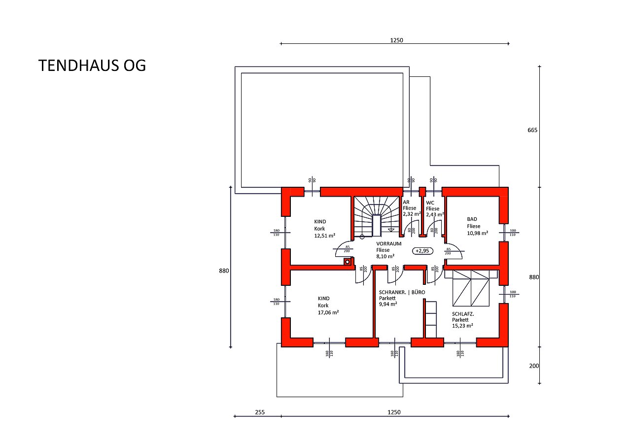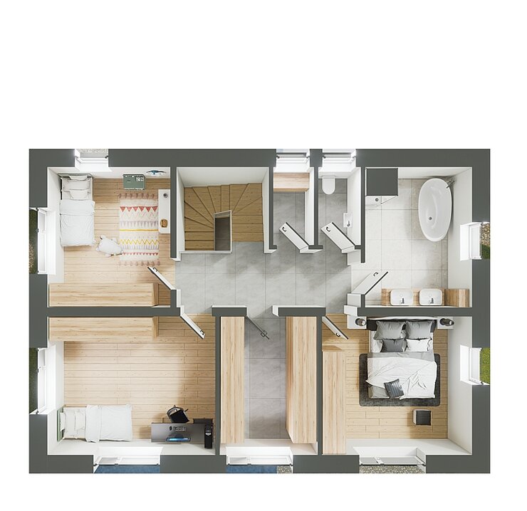 Der Grundriss bietet Platz für 2 großzügige Kinderzimmer und einen zusätzlichen Raum, der im Bedarfsfall für ein drittes Kinderzimmer genutzt werden kann.