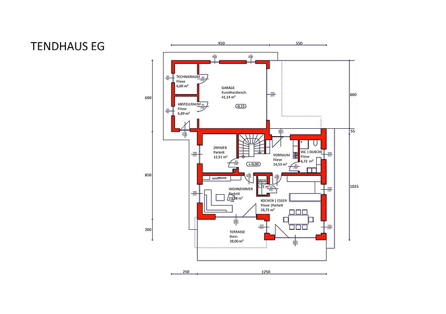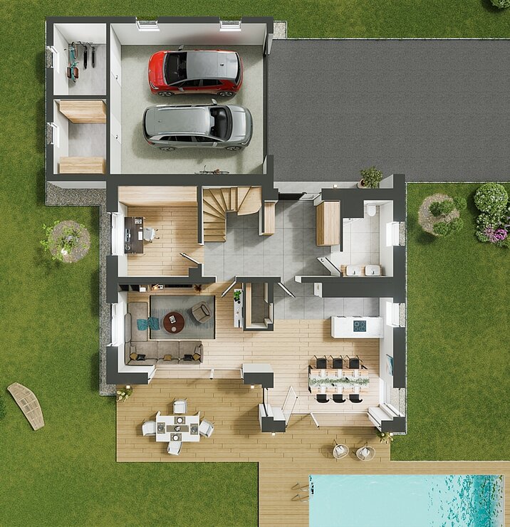 Wohnen ist auf einer Ebene barrierefrei möglich. Abstell- und Technikraum sind in die Garage integriert.