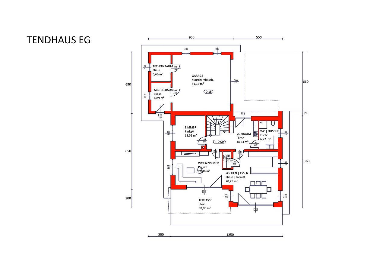 Dieser Grundriss hat eine einfache Raumaufteilung mit einem großzügigen Koch-/ Essbereich. Der Wohnbereich wird durch die überdachte, windgeschützte Terrasse in den Garten verlängert und kann bei Bedarf vom Essbereich abgetrennt werden.